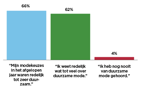 In deze grafiek wordt uitgelicht hoeveel de respondenten weten van duurzame mode. 62% van de consumenten zegt redelijk tot goed geïnformeerd te zijn over duurzame mode. Slechts 4% heeft er nog nooit van gehoord. Dat laat zien dat duurzaamheid een steeds centraler thema wordt binnen het modebewustzijn. Nog belangrijker: tweederde van de consumenten De meerderheid geeft aan dat hun keuzes in het afgelopen jaar ‘redelijk tot zeer duurzaam’ zijn geweest. Kennis vertaalt zich dus steeds vaker in concreet gedrag. Een kans voor merken om hier met duidelijke informatie, transparantie en gerichte communicatie op in te spelen.