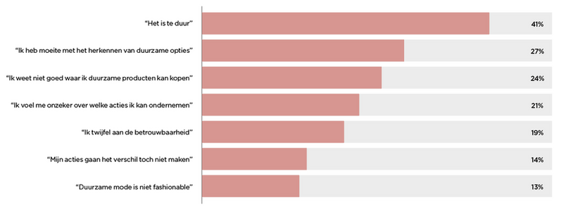 Hoewel de intentie er is, stuiten consumenten op duidelijke obstakels bij het maken van duurzamere keuzes. De grootste drempel is de prijs, gevolgd door moeite met herkennen van duurzame opties en onduidelijkheid over waar te winkelen. Daarnaast weten sommigen niet goed welke stappen te nemen.