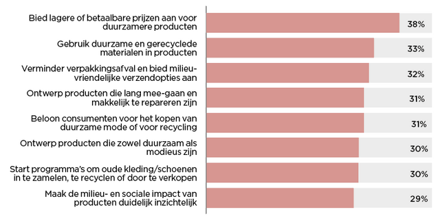 Uit het rapport blijkt dus dat de consument verwacht dat merken en retailers actief bijdragen aan verandering, door duurzame keuzes makkelijker, betaalbaarder en aantrek-kelijker te maken. Deze grafiek laat zien welke acties volgens de consument prioriteit moeten krijgen op weg naar een duurzamer modesysteem.